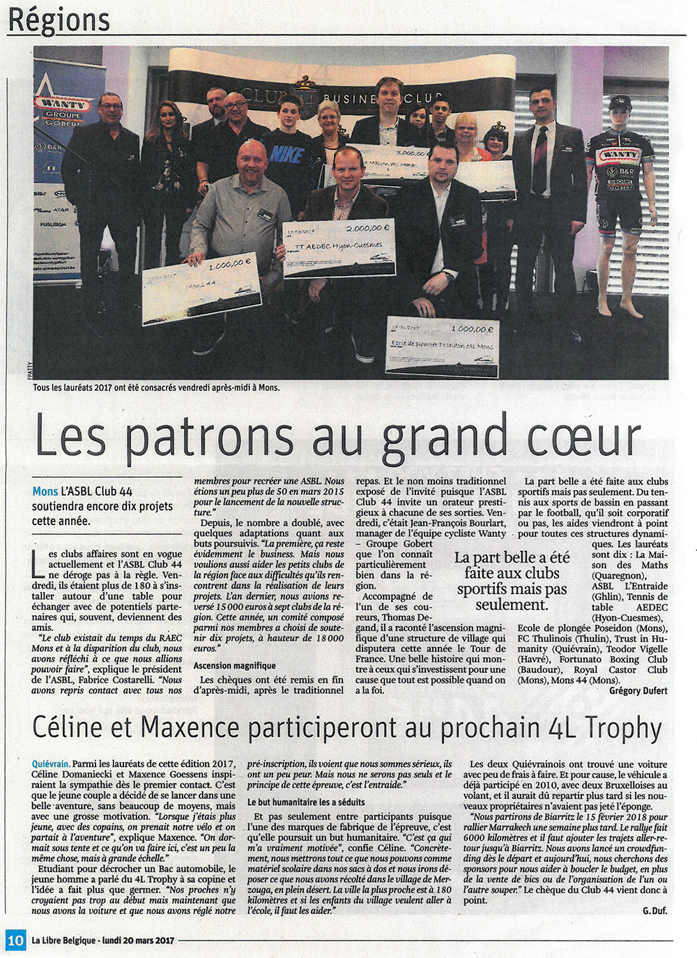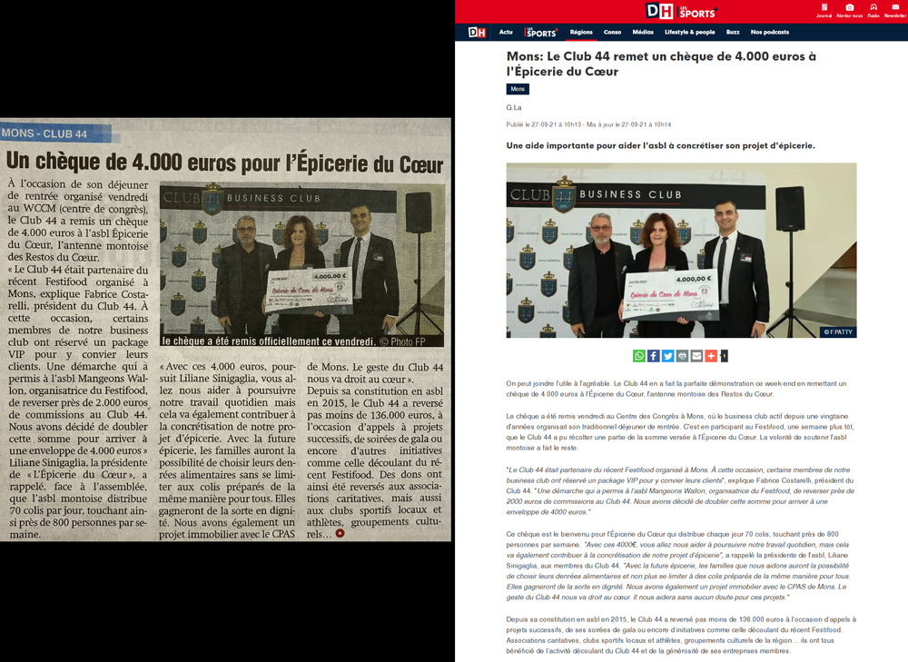 Le Club 44 a remis un chèque de 4.000 euros à L'Epicerie du Coeur à Mons
